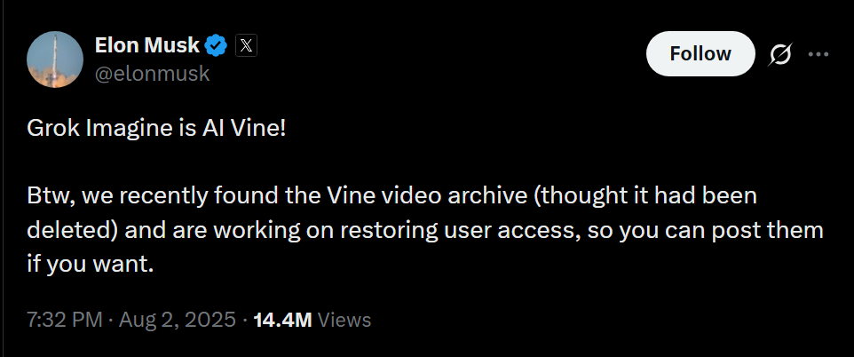 Musk tha se përdoruesit e X do të jenë në gjendje të postojnë këto video Vine, por theksoi se bëhet fjalë vetëm për një arkiv – jo për një rilançim të plotë të platformës. Qëllimet e tij të sakta për markën mbeten të paqarta. Megjithatë, njoftimi për rikthimin e arkivave u shoqërua me një reklamë për platformën e krijimit të videove Grok Imagine, të cilën Musk e quajti “AI Vine”. Ideja është që përdoruesit të mund të krijojnë përmbajtje të shkurtra duke përdorur vetëm komanda me tekst, në vend të xhirimeve tradicionale.