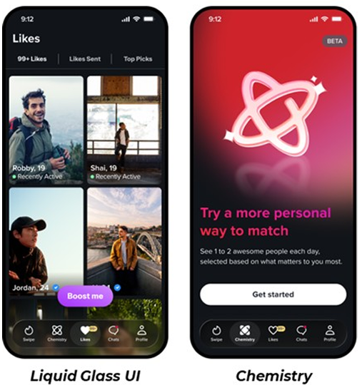 Përveç “Chemistry”, Tinder po zgjeron përdorimin e gjuhës natyrore gjenerative për të përmirësuar komunikimin brenda aplikacionit. Një model i ri paralajmëron përdoruesit përpara se të dërgojnë mesazhe potencialisht ofenduese. Gjithashtu, platforma planifikon përditësime më tradicionale si “modalitete” të reja takimesh, një ndërfaqe profili të ridizenjuar, njohje fytyre dhe shërbime të tjera për të rritur ndërveprimin.