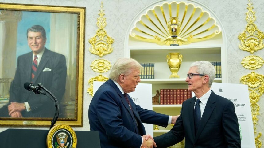 Gjatë një konference për shtyp në Zyrën Ovale, CEO i Apple, Tim Cook, i dhuroi Presidentit Donald Trump një skulpturë të personalizuar me bazë prej ari 24 karatësh, përpara se Trump të shpallte një investim të ri prej $100 miliardë nga Apple në SHBA. Ky zhvillim e çon angazhimin total të Apple për investime në SHBA në $600 miliardë, të cilin Trump e cilësoi si “historik”.