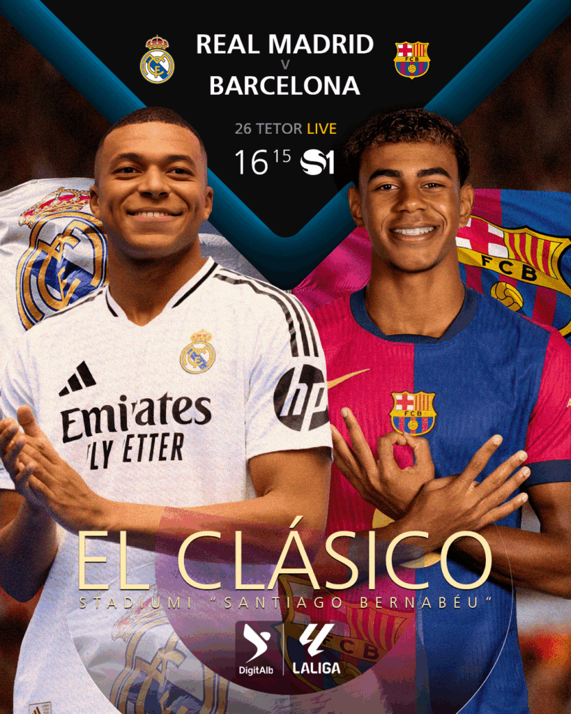 Spektakli i El Clasico nis të dielën, më 26 tetor, në orën 16:15, dhe transmetohet live dhe ekskluzivisht në SuperSport 1, vetëm në DigitAlb. Dhe nëse ende nuk e ke paketën sportive tëDigitAlb, bëj upgrade në paketën Premium dhe përfito deri në 10,000 lekë ulje. Kjo ofertë është e vlefshme deri më 31 Tetor, në të gjitha pikat e shitjes DigitAlb, si edhe online në digitalb.al.
