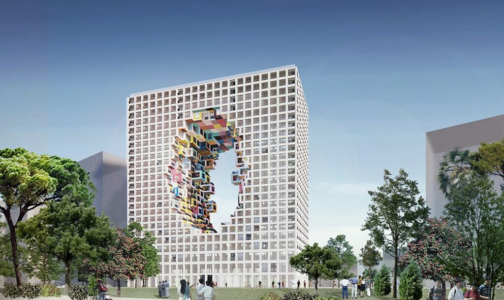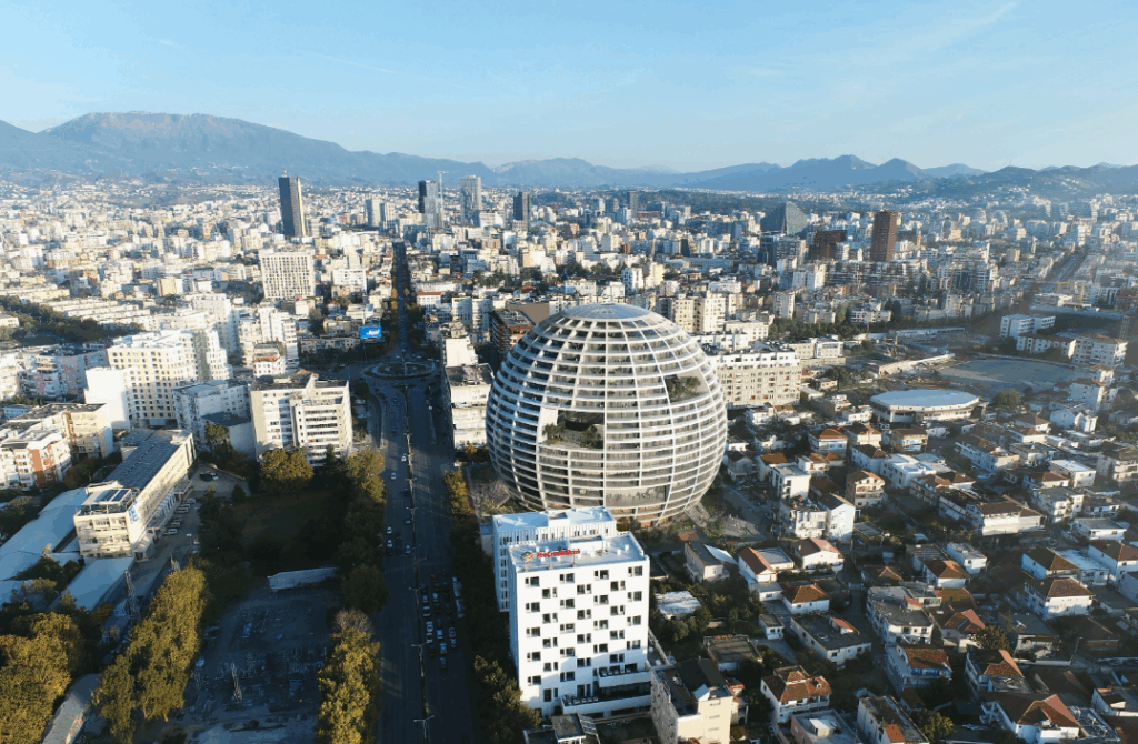 MVRDV, një nga studiot më të mëdha dhe më të suksesshme në botë, po i jep formë edhe Tiranës, nga ndërhyrjet publike te volumet e reja duke e shtyrë qytetin drejt dimensioneve moderne. Para “Grand Ballroom”, MVRDV ka punuar në disa pika të rëndësishme të kryeqytetit, duke kombinuar hapësira publike dhe programe të përziera: Piramida e Tiranës (rikualifikim me funksione publike/edukative), Tirana Boulevard (ndërtesë miks me një “urban room” të brendshëm), Downtown One (kullë miks me fasadë “piksel”) dhe Skanderbeg Building. Këto prirje ndihmojnë të lexohet ambicia e arenës së re: karakter i fortë, por jetë e përditshme.