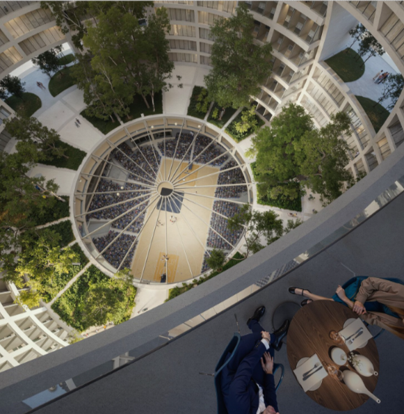 Objekti nuk “fiket” kur s’ka ndeshje. Rreth bazës shtrihen retail dhe food hall, ndërsa sky bar-i dhe hoteli e mbajnë ndërtesën aktive gjatë gjithë ditës. Plaza përpara shërben si fan zone e hapur, vend takimi e pritjeje, apo skenë për aktivitete të vogla komunitare.