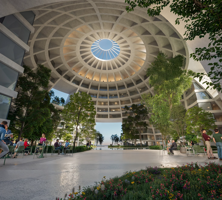 Funksioni kthehet në përvojë: disa dhoma hoteli kanë pamje nga fusha, oborri i banesave sjell qetësi brenda një objekti energjik, sky bar-i hap horizontin drejt skyline-it të Tiranës. Qëllimi është një arenë e lehtë për t’u arritur, për t’u kuptuar dhe për t’u dashur.