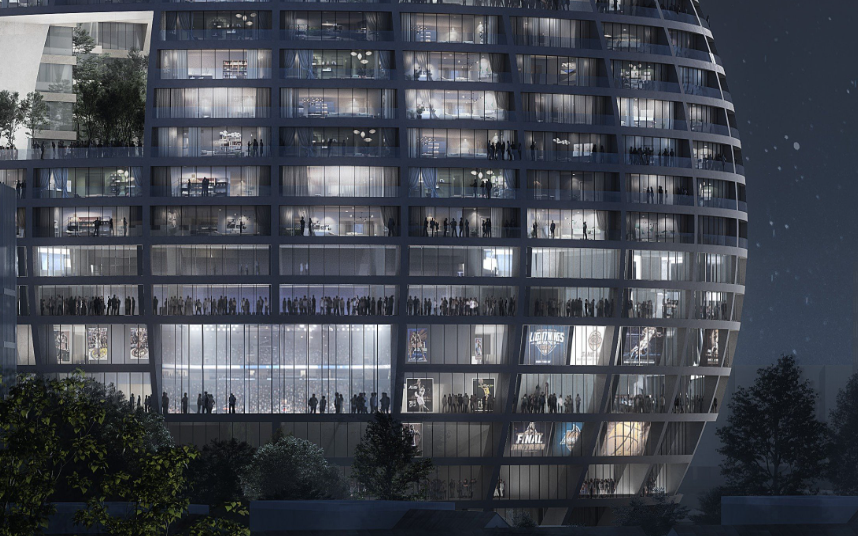 Objekti nuk “fiket” kur s’ka ndeshje. Rreth bazës shtrihen retail dhe food hall, ndërsa sky bar-i dhe hoteli e mbajnë ndërtesën aktive gjatë gjithë ditës. Plaza përpara shërben si fan zone e hapur, vend takimi e pritjeje, apo skenë për aktivitete të vogla komunitare.