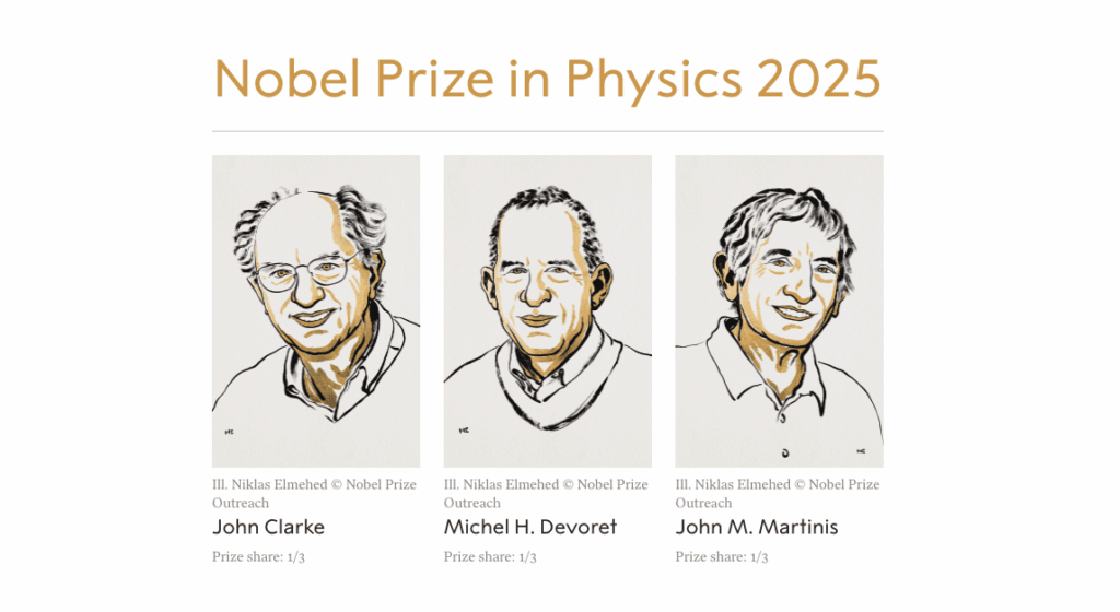 John Clarke, Michel H. Devoret dhe John M. Martinis janë shpallur fituesit e Çmimit Nobel në Fizikë 2025 për eksperimentet e tyre që treguan se dy parime thelbësore të mekanikës kuantike (tunelimi kuantik dhe sasia e energjisë në nivele të caktuara) mund të vëzhgohen në një sistem të madh sa për t’u parë me sy të lirë. Zbulimi i tyre, i bërë në vitet 1984-1985, përbën një hap të madh në kuptimin e mënyrës se si ligjet që zakonisht vlejnë për grimcat subatomike mund të manifestohen në objekte makroskopike.