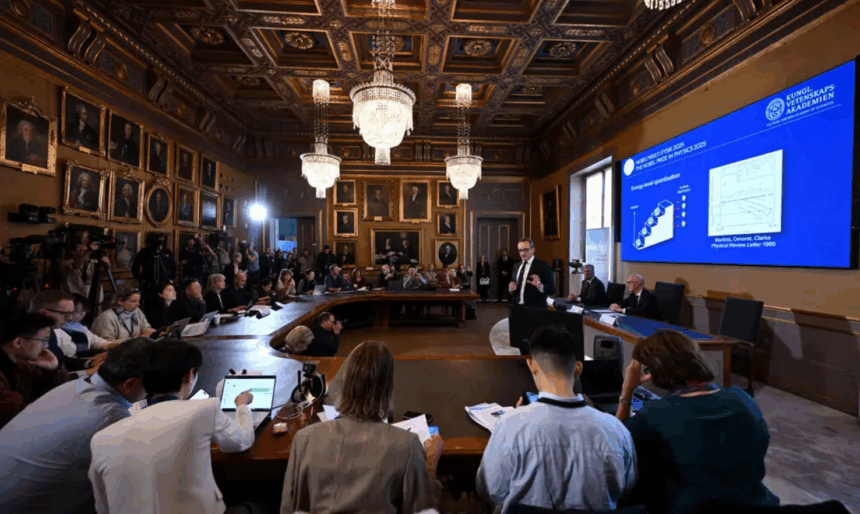 John Clarke, Michel H. Devoret dhe John M. Martinis janë shpallur fituesit e Çmimit Nobel në Fizikë 2025 për eksperimentet e tyre që treguan se dy parime thelbësore të mekanikës kuantike (tunelimi kuantik dhe sasia e energjisë në nivele të caktuara) mund të vëzhgohen në një sistem të madh sa për t’u parë me sy të lirë. Zbulimi i tyre, i bërë në vitet 1984-1985, përbën një hap të madh në kuptimin e mënyrës se si ligjet që zakonisht vlejnë për grimcat subatomike mund të manifestohen në objekte makroskopike.