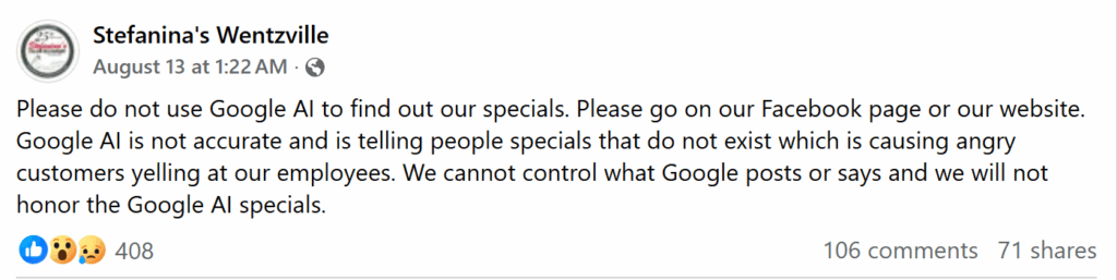 Në një postim në Facebook, restoranti u shpreh qartë: “Google AI nuk është i saktë dhe po u thotë njerëzve specialitete që nuk ekzistojnë. Ne nuk mund t’i kontrollojmë ato që Google poston dhe nuk do t’i nderojmë ato oferta.” Sipas pronarëve, sistemi madje ka shpikur pjata të reja dhe ka pretenduar se restoranti ofron një picë të madhe me çmimin e një të vogël.