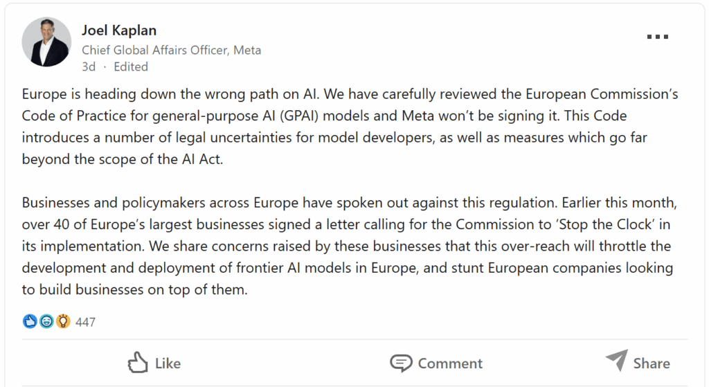 Shefi i çështjeve globale të Metës, Joel Kaplan, shkroi në një postim në LinkedIn se “Evropa po ndjek rrugën e gabuar për AI“, dhe shtoi se kodi krijon pasiguri ligjore për zhvilluesit dhe përmban masa që tejkalojnë përmbajtjen e Aktit për AI.